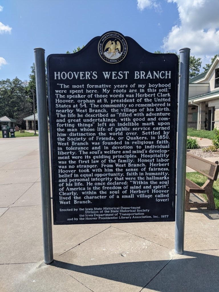 And lastly, a rest stop down the road from the Herbert Hoover Presidential Museum and Library in West Branch, Iowa, had a nice little monument plaque for folks to consider about the historic U.S. leader before they used the bathroom. I don’t know bears from skin when it comes to Herbert Hoover, but he described his upbringing here as “filled with adventure and great undertakings, with good and comforting things.”