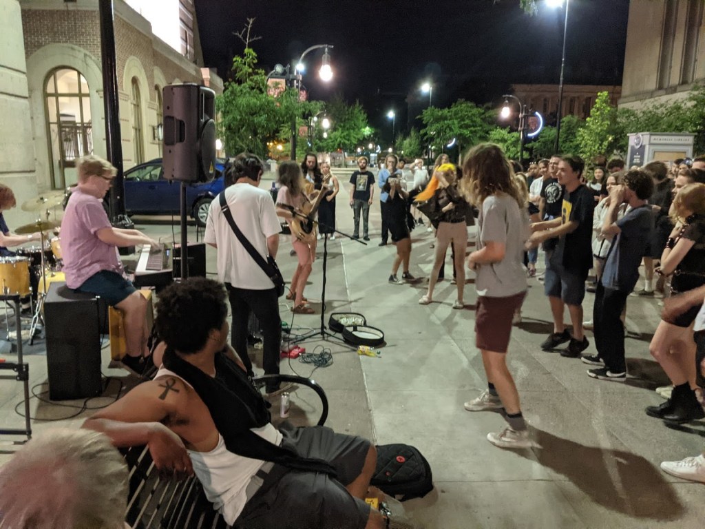 As I walked back to the hotel, I heard live music being played in the distance. I walked over to the university bookstore, and a punk band was playing right on the street. Whether the show was officially sanctioned by a host, or whether it was a true, guerilla-style DIY show right on the road, the mob of attendees pulsed like was a true revolutionary act.