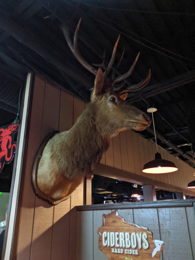 At halftime, the Bucks held on to a slim 47-43 lead. I popped up to my room to freshen up (find a fratty-looking hat), then walk over to State Street Brats, the signature “Wisconsin sports” bar for the city and campus. (Bloomington readers might find an easy explanation as thus: It’s prestigious like Nick’s, but laid out like Kilroy’s Sports).