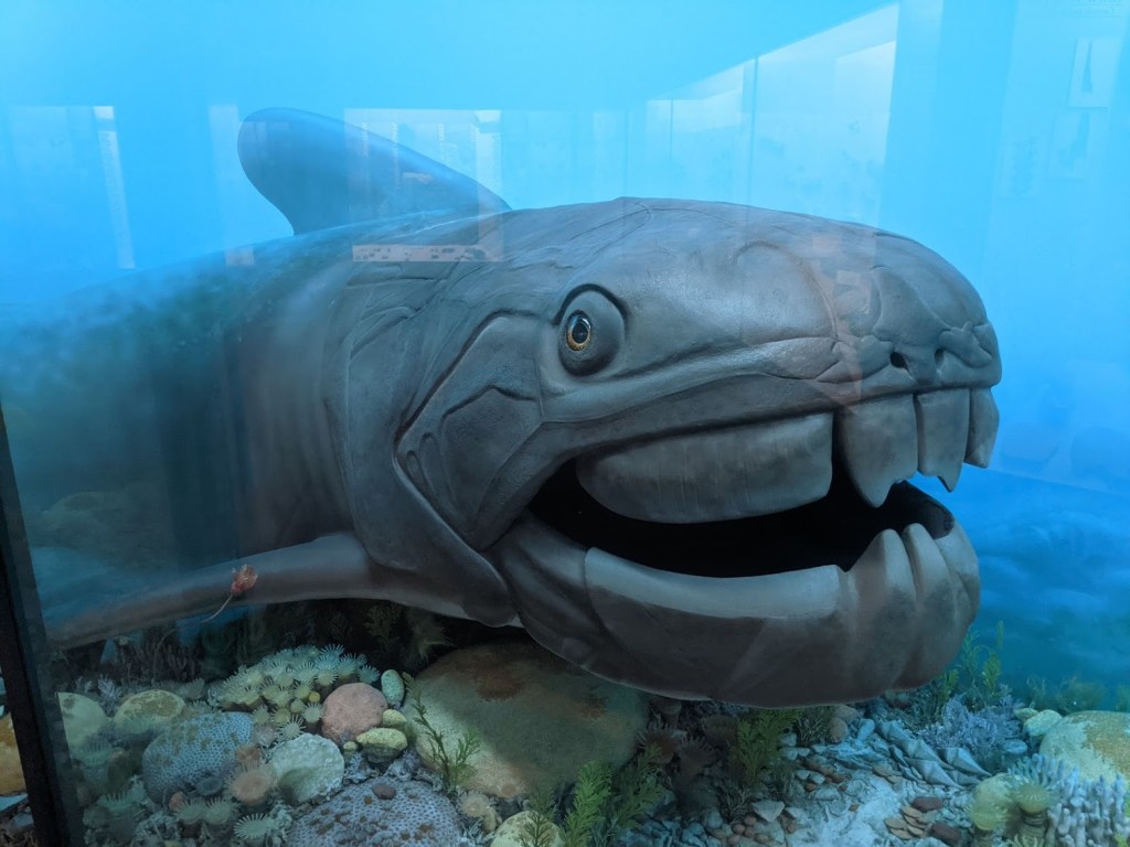 Artist’s rendering of a crazy-eyed proto-fish with a punchable face on display at the University of Iowa Museum of Natural History.