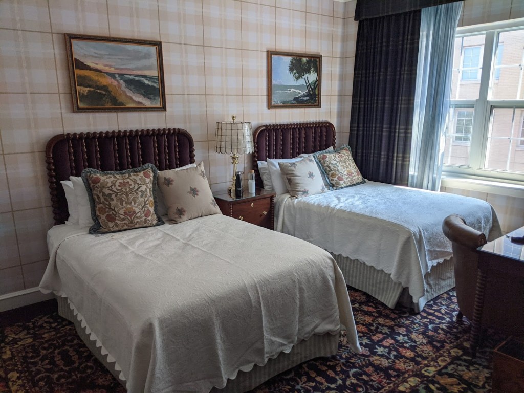 The open patio has eight classic rocking chairs, and the first-floor hotel lobby has a fine bar with padded leather booths and brass lighting fixtures. My room has classic antique furniture, including a wooden wardrobe and an upholstered corner chair, as well as polished headboards and tapered quilts.