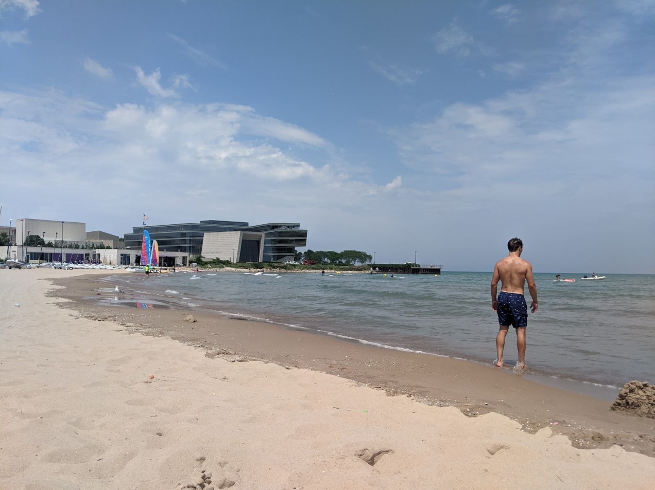 After my remote work session ended Wednesday afternoon, I took a short walk from the hotel to mellow out on Clark Street Beach, a petite strip of heaven bordering Lake Michigan, where the clean turquoise water ebbs lightly against pure-white sands. Some of Northwestern University’s most stunning architectural feats, such as the Biennen School of Music, butt up against the shore, creating a contrast of prehistoric bliss and post-modern capabilities.