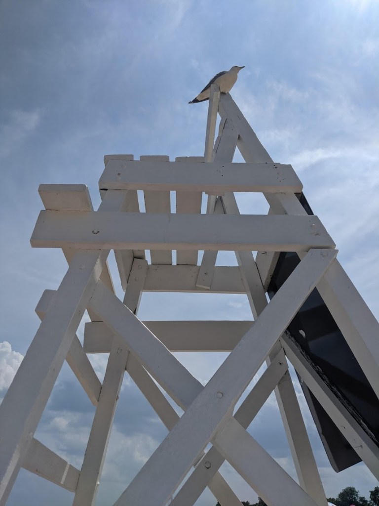 A flock of seagulls stood to the far end of the swimming area, occasionally pecking around for stray food or to rest on an empty lifeguard’s chair, flying around and squawking with some degree of interest.