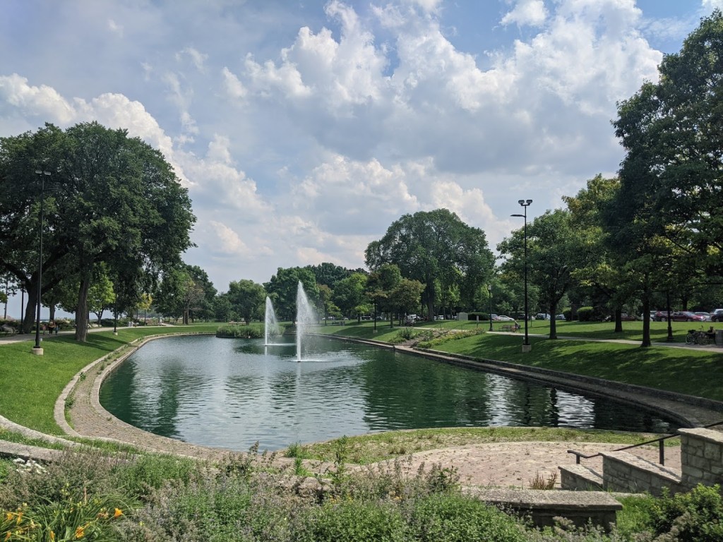 After getting my fill of beachtime (and picking the grains of sand out of my teeth), I hiked over to the Lakefront Lagoon, which was restored in 2014, to dry off in the sun. It’s a historic little body of water with two stunning fountains, and it plays host to several families of ducks, as well as their duckling babies. I took a lap along the edge of the algae-filled water to get a closer look before it started raining, at which point I called off my beach evening and retreated to the hotel to shower any remaining sand off my body (and out of my mouth).