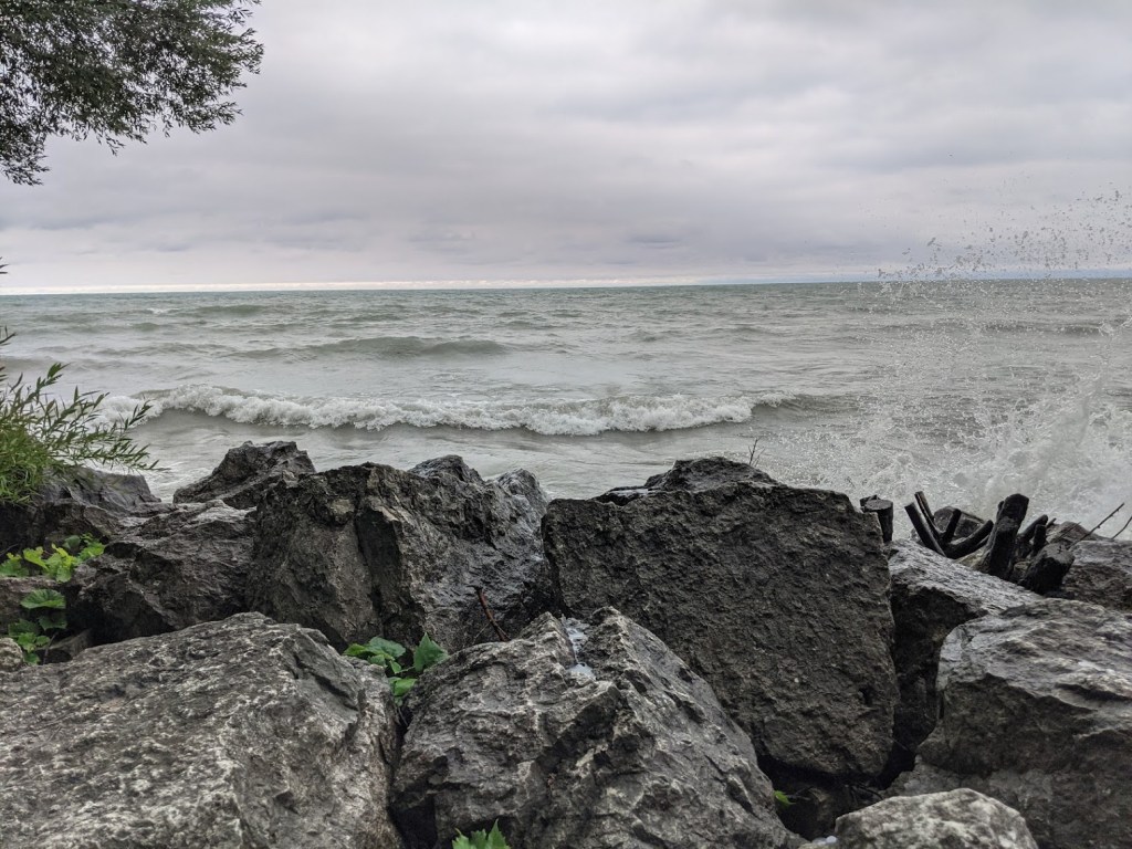 However, there was a pleasant little wildflower trail garden, and the adjacent beach was free to walk on. I spent a half-hour watching aggressive waters crashing against the shore, splattering and spitting across heavy rocks and boulders, on the gloomy and gray day. I stood under a heavy treeline and took in the raw, visceral power of the Great Lakes. As compared to Wednesday’s beach lull, Thursday’s trip to the shore brought a humbling sense of nature’s strength, and a subsequent sense of poetic calm.