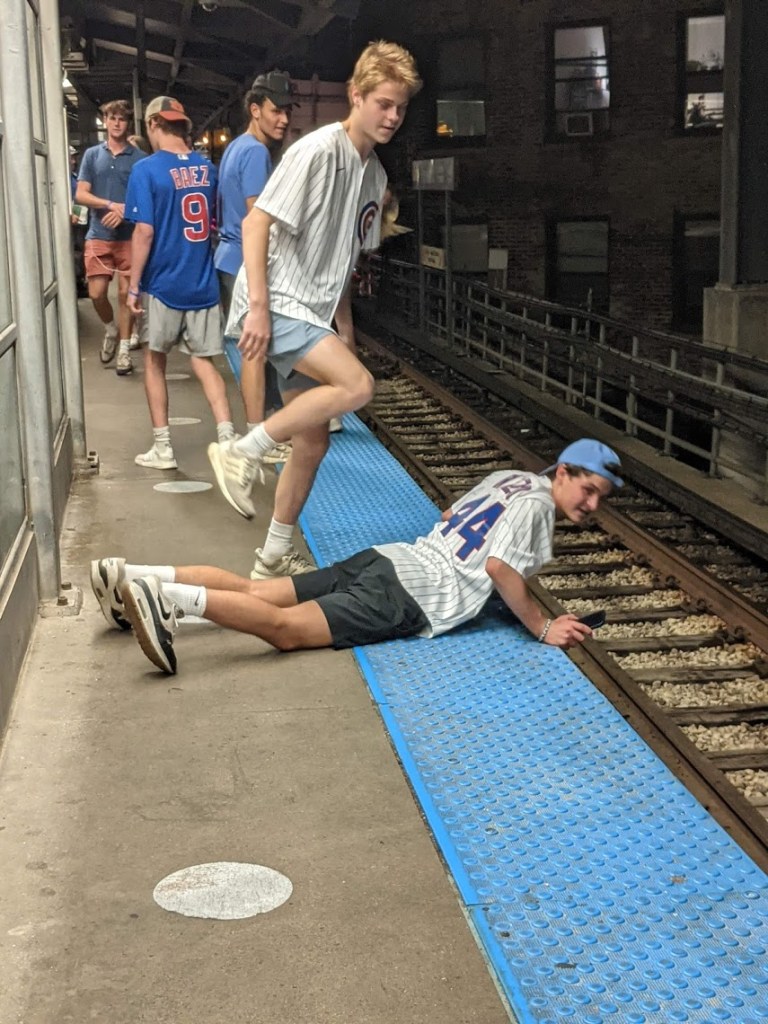 Danny laid down on the grimy platform in his clean and sporty Cubs jersey, leaning over into the gap to try and reach his phone.