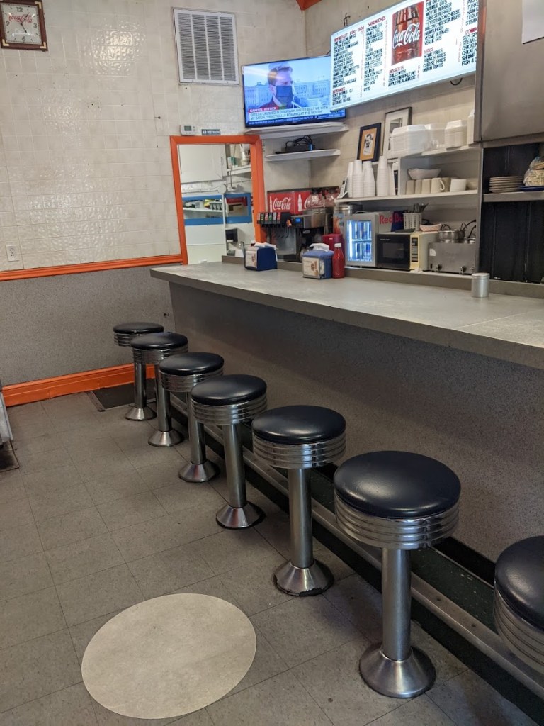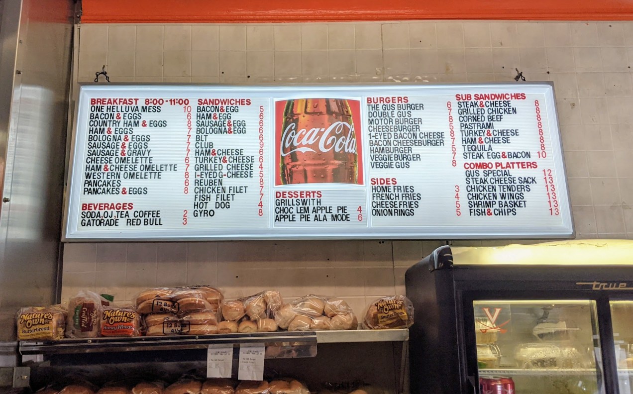 The White Spot, apparently, is a favorite of locals near the UVA campus. Three students were enjoying their meal outside (somehow, in the humid 100-degree heat index) while Cory and I sweated it out at the counter inside, which he said reminded him of the southern sit-in boycotts of the Civil Rights Era — the kind of establishments with round, steel stools with a mild vinyl padding, and a linoleum eating surface that spans the length of the eatery. Mentally, you could place it among collective cultural visions of early-stage McDonald’s, or what (the currently flailing and failing) Steak & Shake wanted you to believe they were all along.